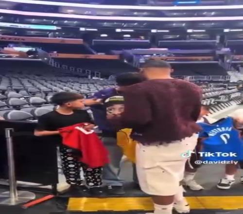 慈世平晒参加湖人亲子活动:感谢东契奇和詹姆斯与我孙女合影