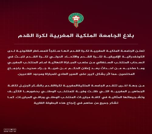 摩洛哥皇家足球协会宣布,将针对塞内加尔队在决赛对阵摩洛哥队时,在裁判判罚无可争议的点球后(该判罚已获专家共识)擅自离场及相关后续事件,向非洲足球联合会和国际足球联合会启动法律程序。此行为严重影响了比赛的正常进行及运动员状态。