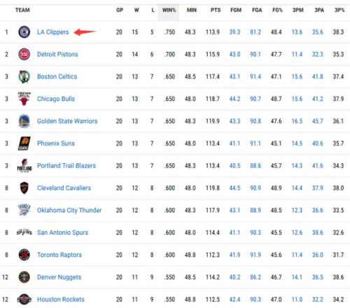 近20场胜率排名:快船居首勇士开拓者并列第3雷霆第8火箭第12