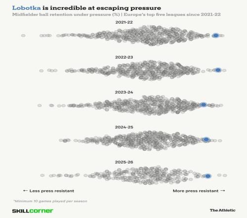多年来,这位身材矮小的斯洛伐克中场一直是欧洲最擅长抗压控球的球员之一。当The Athletic向他展示SkillCorner数据,证明他在高压下的控球能力时,洛博特卡腼腆地表示:“我真的很惊讶自己能这么出色。