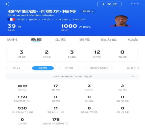 梅特,现年18岁,法国前锋,本赛季代表雷恩出战17场法甲,贡献3球2助,德转身价1000万欧。