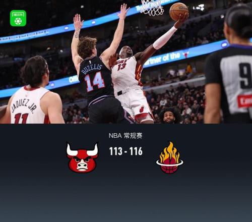 北京时间1月30日NBA 常规赛,芝加哥公牛对阵迈阿密热火。次节开始热火便持续保持10分上下领先,比赛还剩最后4分钟时,热火突然断电,公牛多森姆连得9分领衔追分,在比赛还剩最后10秒迫近至1分,随后采取犯规战术,最后一攻科比怀特绝平三分不中,最终热火116-113公牛。